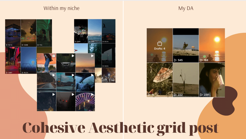 As discussed in my last blog post, I’ve been evolving my Digital Artifact based on an aesthetics analysis of my media niche on TikTok and Instagram. In the development of my DA, I’ve made a cohesive grid post on both platforms, as I’ve observed other creators in my niche accomplish. By taking on the “aesthetic styles” presented in my niche to adhere to “such communicative forms that tie the ephemeral appearance of individual contents to a larger frame of reference (Schellewald, 2021, p. 1439).” Thus, become a participatory individual content creator within the larger niche through establishing an aesthetic. I’ve made content in a vintage/retro style, editing footage from my camcorder into short aesthetically pleasing videos with complimentary old school music. I’ve observed this technique being used effectively throughout my niche to establish an aesthetic, for example, a rainy day video will often have the audio as a song from the Twilight series. This is true for the niche on Instagram too, where creators will “establish and follow a particular temporal pattern” based on aesthetics to enhance the audience appeal (Manovich, 2019).
