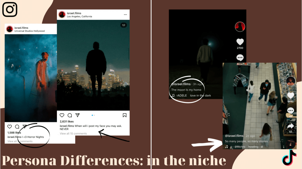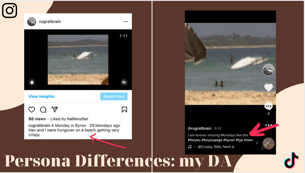 To elaborate further upon the platform differences I began to highlight in my previous blog post, as a result of my problematising, I’ve found several differences between the TikTok and Instagram communities within this media niche. Beyond the physical aesthetics aspect of my research, is a notable observation I’ve made about the difference in creators’ personas on each platform. Instagram has a “particularly wide-ranging spectrum of publicness” this publicness, makes the presentation of persona more susceptible to random audiences, therefore within the niche the bigger audience creates a less intimate presentation of persona (Moore et al. 2017, p. 2). With TikTok, there is a level of anonymity to the persona, which is then used as to what feels like a safe way of connecting with others in the app without disclosing your “publicness” as you would on Instagram (Moore et al. 2017, p. 2). Thus, in my DA, I’ve established a slight distinction in my persona between the two apps, Instagram being more public and professional, while TikTok is more thought-provoking and intimate, adhering to the escapism experience exclusive to that app. I aim to do this primarily through the captions of my videos, speaking more personally on Instagram, giving backstory to the video. On TikTok, I’ll have brief captions aiming to evoke emotion based on the video content, a more detached version of the “publicness” of the Instagram persona (Moore et al. 2017, p. 2).